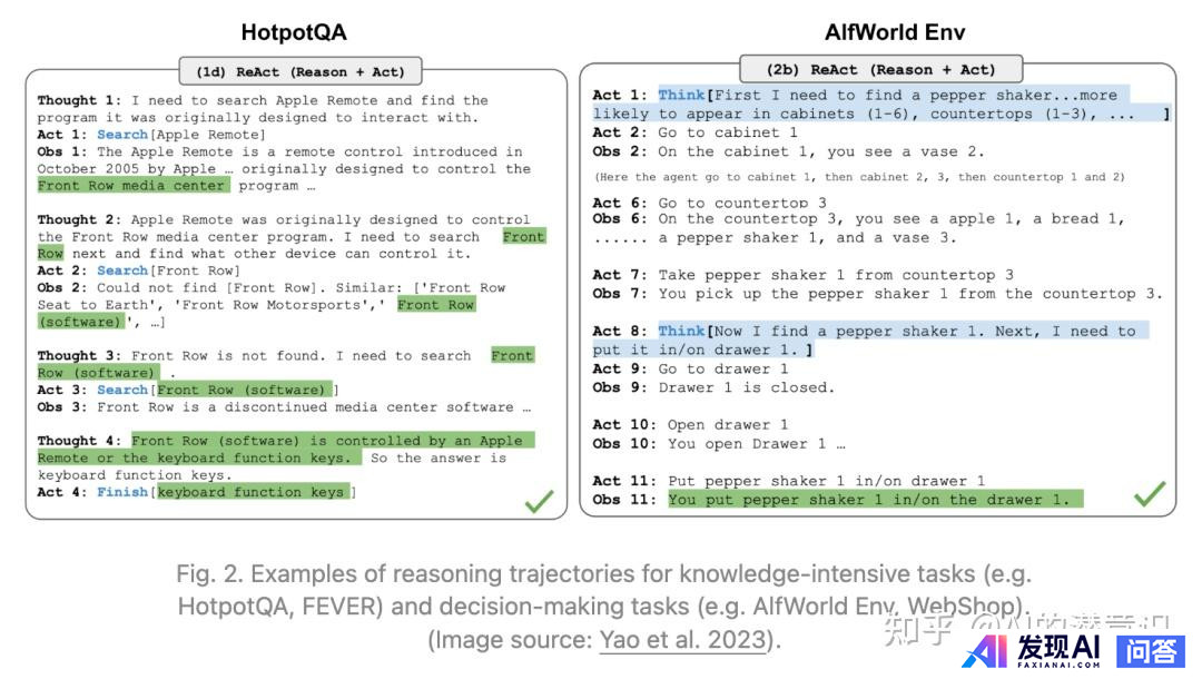 「ReAct」通过将行动空间扩展为特定任务的离散行动和语言空间的组合,将推理和行动集成到 LLM中。前者使 LLM 能够与环境交互(例如使用维基百科搜索API),后者能够促使LLM 生成自然语言的推理轨迹。