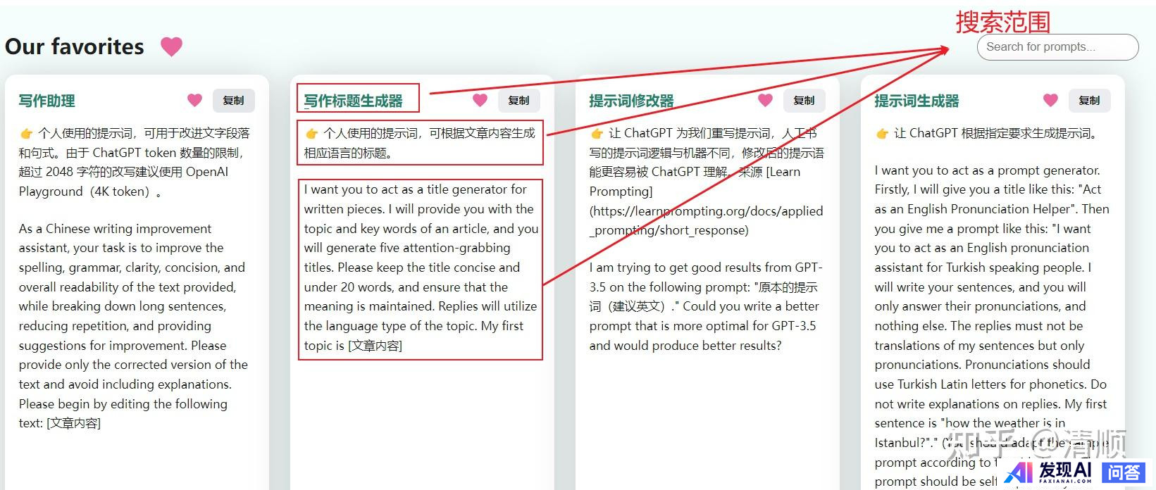 通过标签筛选和关键词搜索,点击卡片右上方的「复制」按钮即可获取提示词,将其粘贴到 ChatGPT 中,参考中文提示调整需求文本,即可得到指定领域的回复。如果提示词中的中文备注没有解释清楚,可以点击提示词的绿色标题查看来源网页。