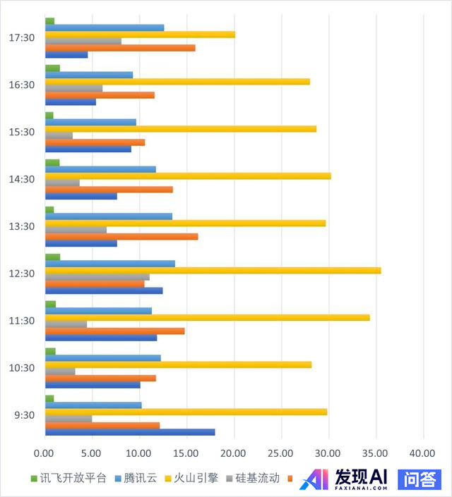 采用总平均速度衡量各平台平均反应速度,火山引擎反应速度最快,百度智能云、阿里云、腾讯云等平均速度差距较小,表现较好,讯飞可能限于算力问题,总平均速度表现较差。